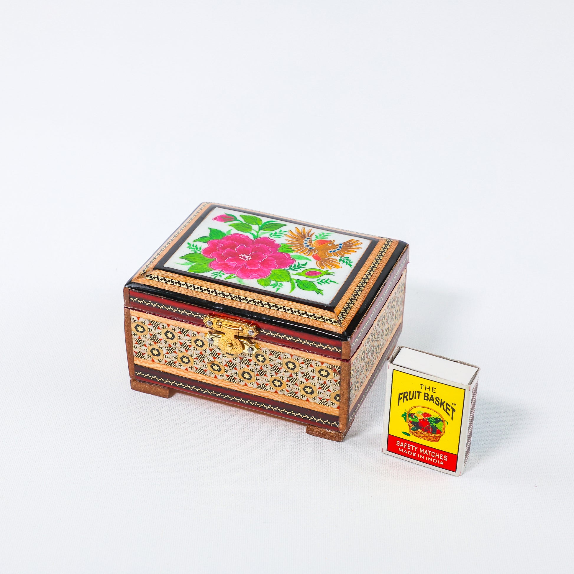 Hinged Jewelry Box – Flower & Bird Painting – Velvet Interior – Size 8 × 11 cm
