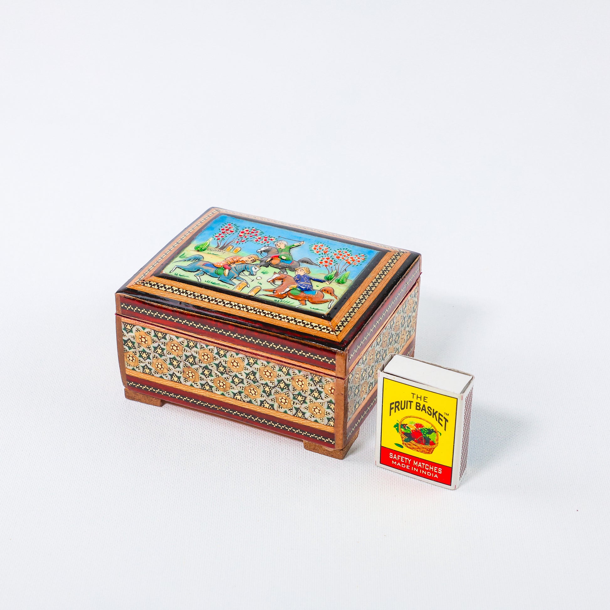 Hinged Jewelry Box – Hunting Scene Painting – Velvet Interior – Size 8 × 11 cm