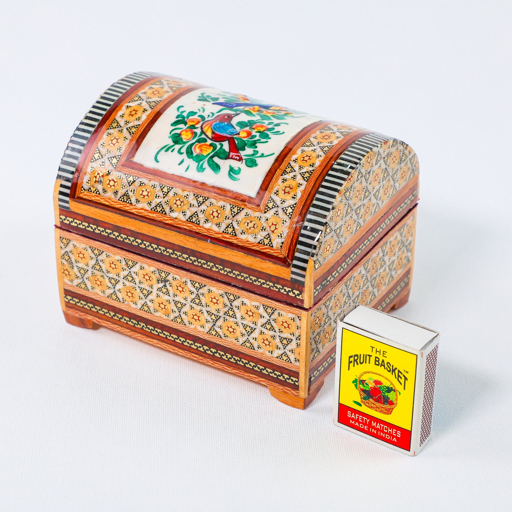 Khatam Chest – Flower & Bird Painting – Velvet Interior – Size 10 × 12 cm