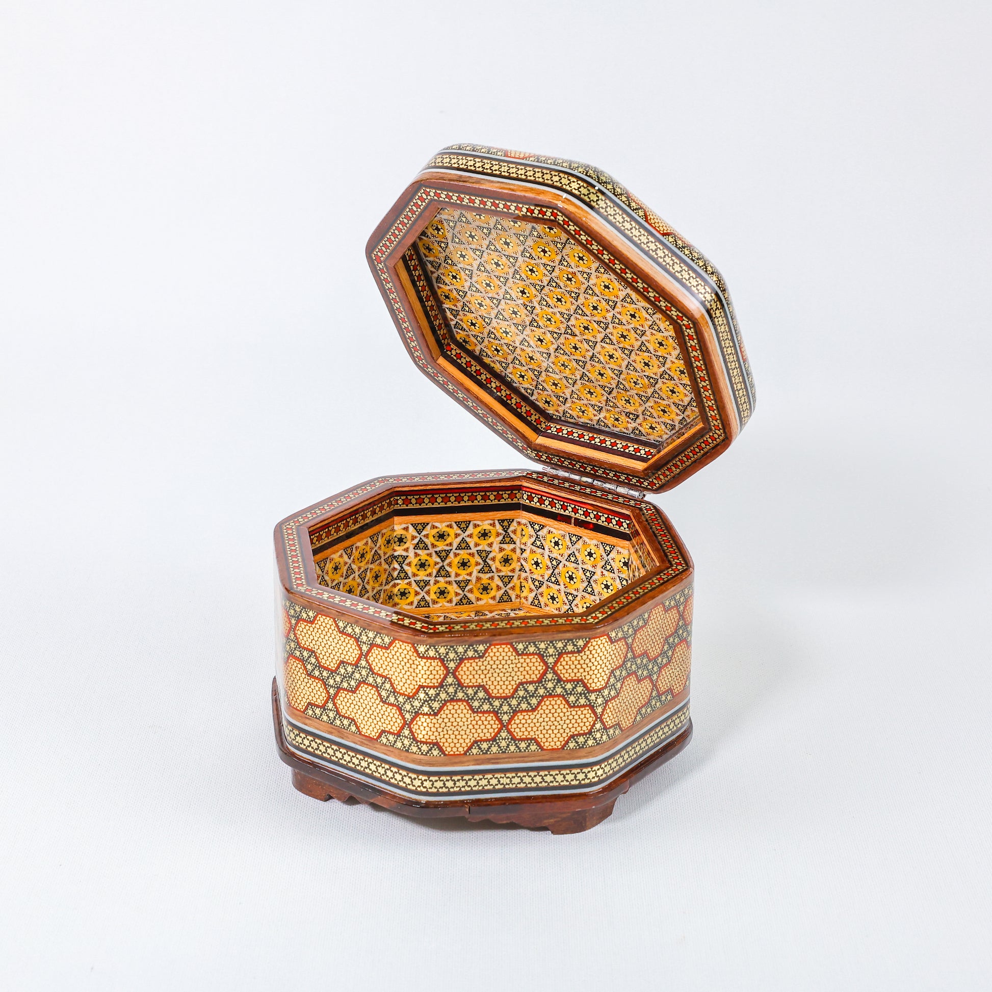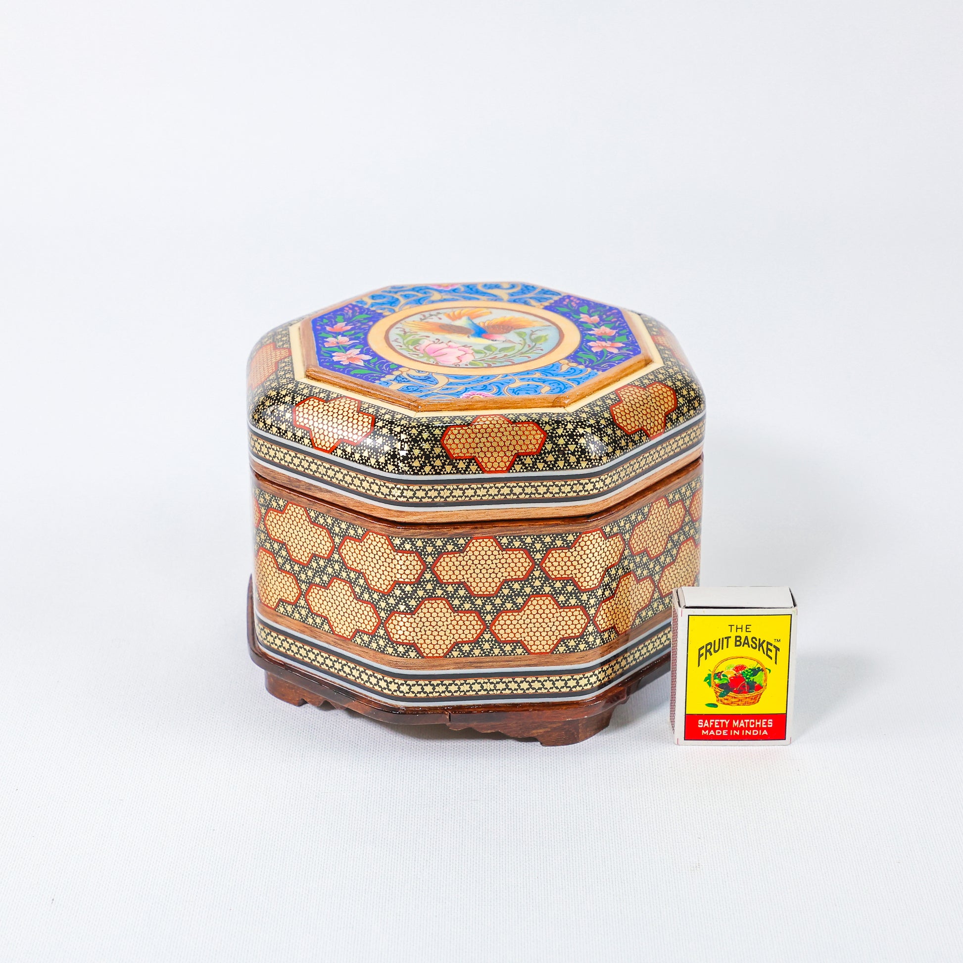 Hexagonal Jewelry Box – Khatam Interior – Flower & Bird Painting – Size 5 × 5 cm