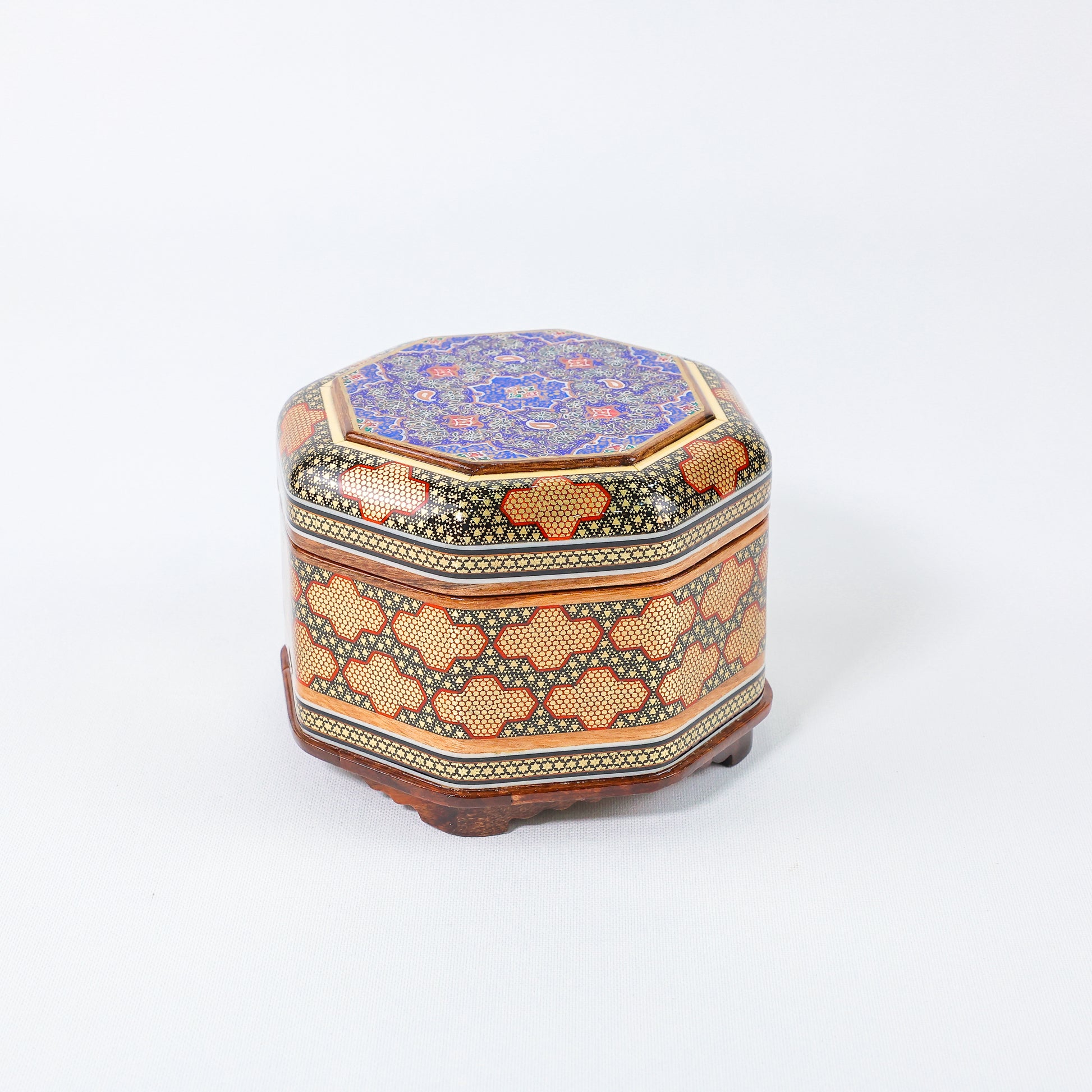 Hexagonal Jewelry Box – Khatam Interior – Tazhib Painting – Size 5 × 5 cm