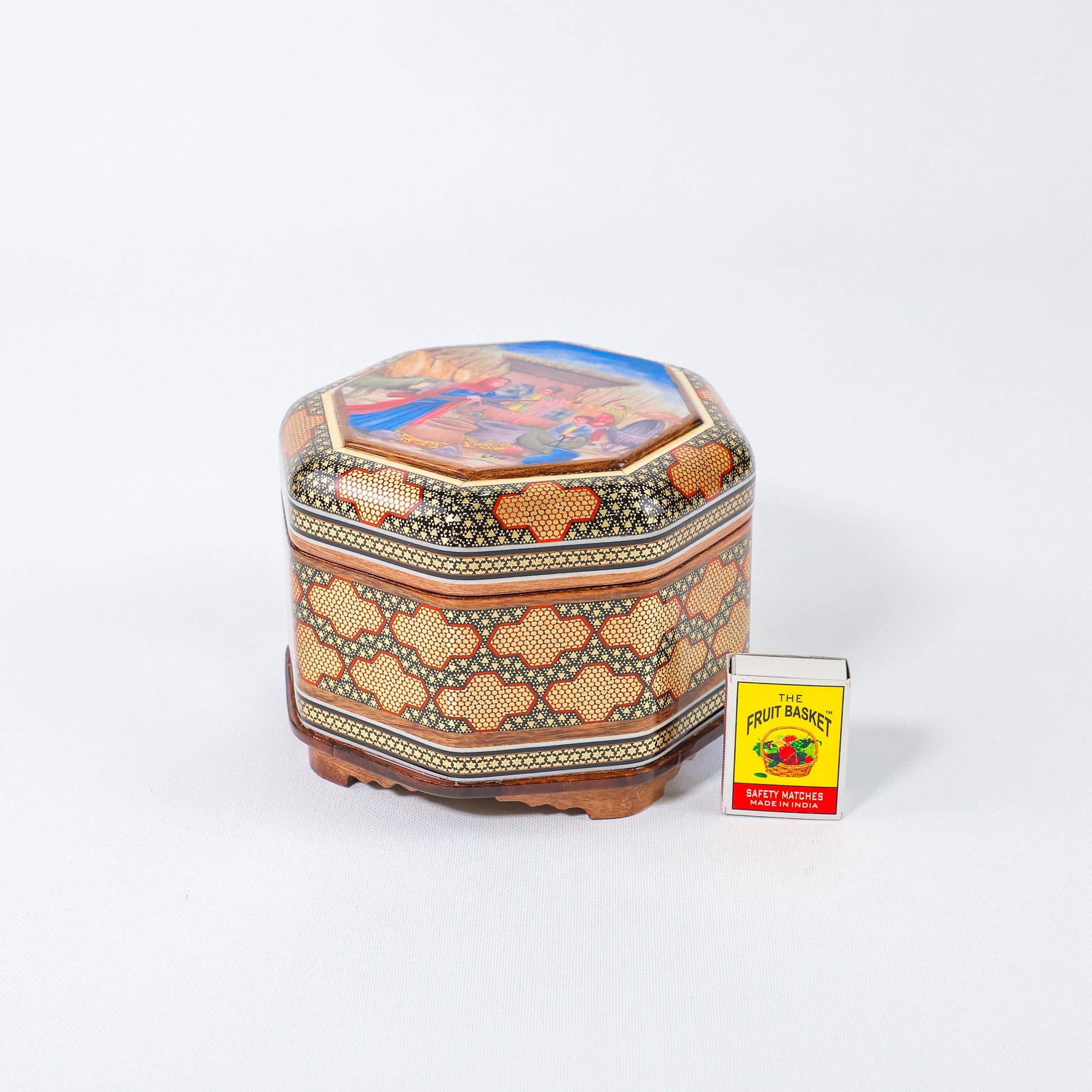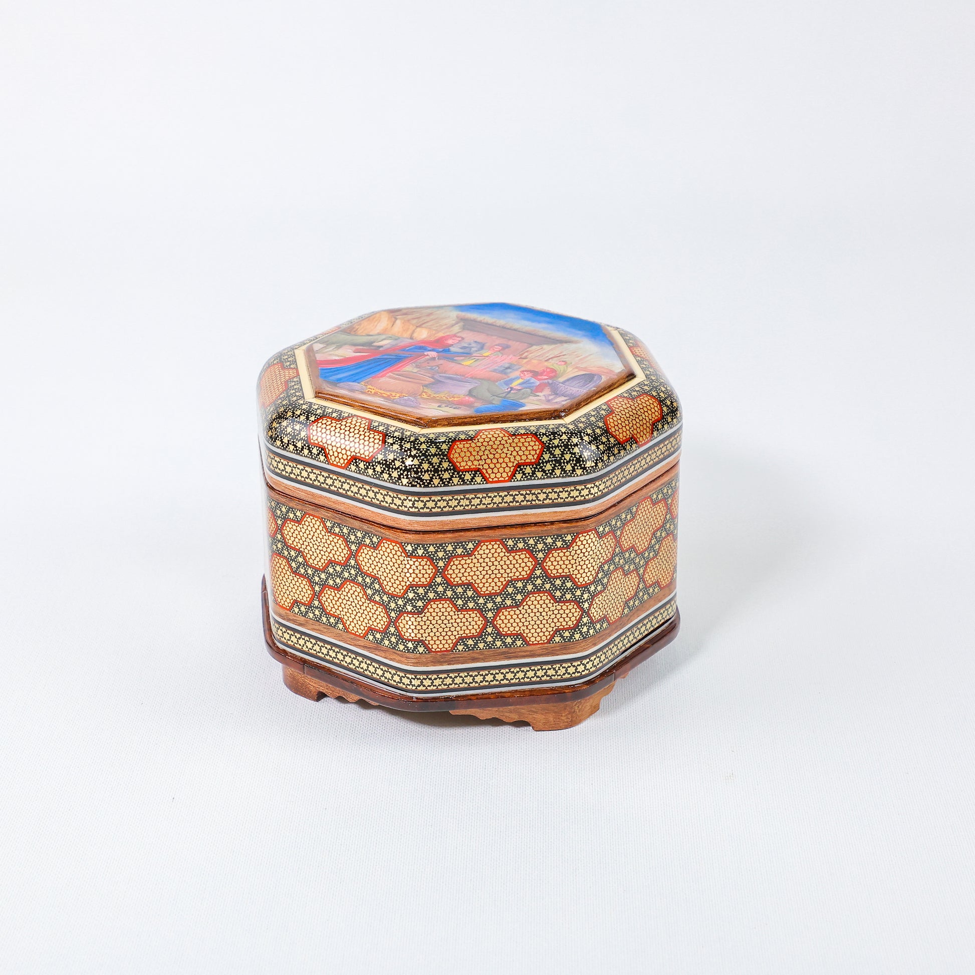 Hexagonal Jewelry Box – Khatam Interior – Tribal Painting – Size 5 × 5 cm