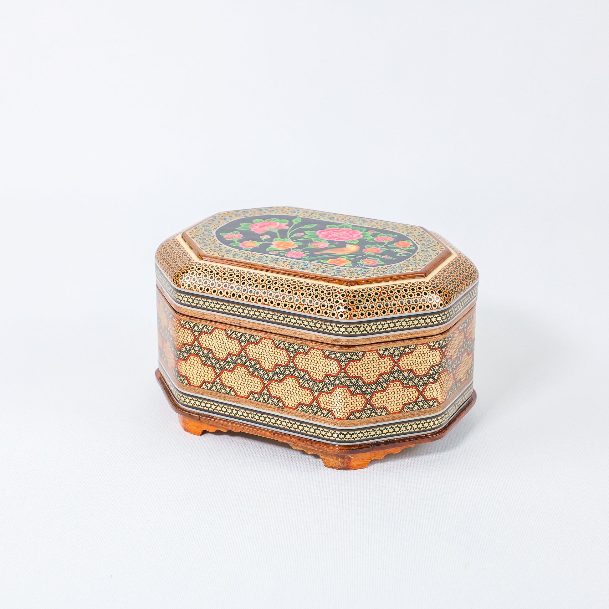 Octagonal Jewelry Box – Full Wire Khatam – Flower & Bird Painting – Size 15 × 20 cm